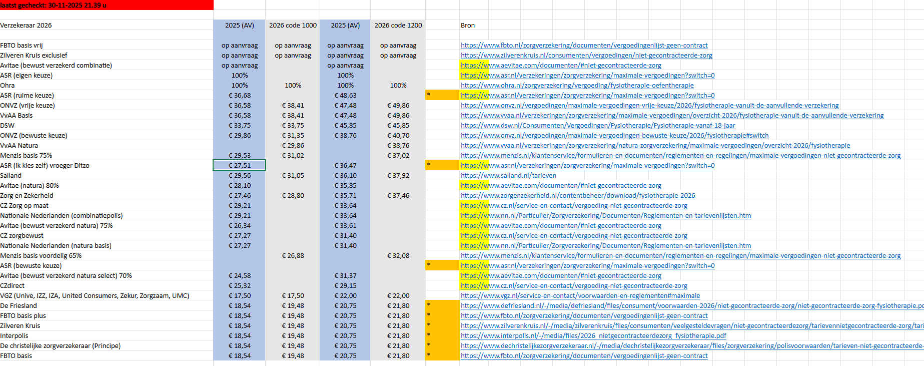 In de onderstaande afbeelding vind je de vergoeding per zitting fysiotherapie voor 2025.